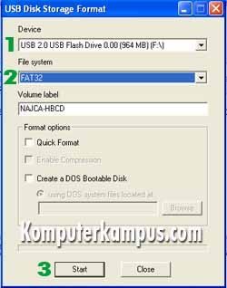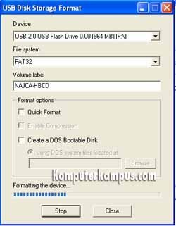 Pilih Device dengan alamat USB Flashdisk anda, contoh di komputer saya adalah "Drive F", kemudian pilih File System dengan "FAT 32" dan setelah itu klik "Start". akan tampil jendela peringatan apakah yakin akan memformat, klik saja "Yes" jika data di flashdisk anda sudah di backup (karena akan di format). kemudian akan tampil proses format seperti gambar berikut :