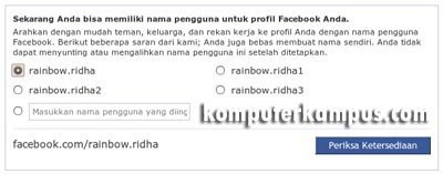 caranya anda login dulu keakun facebooknya, kemudian klik link berikut ini disini maka anda akan di arahkan untuk memilih nama pengguna seperti gambar berikut (sebagai contoh saya bikin akun rainbow.ridha) :